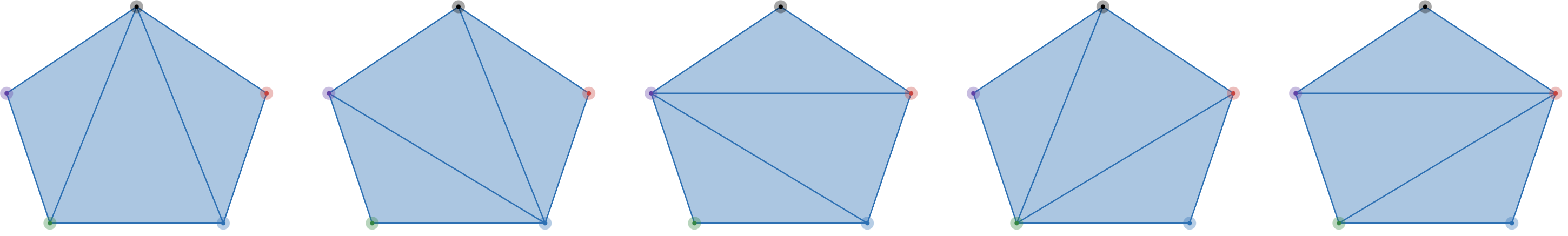 在第二个样例中,所需多边形必须有 $\tfrac{5!}{4! 1!} = 5$ 种三角剖分。