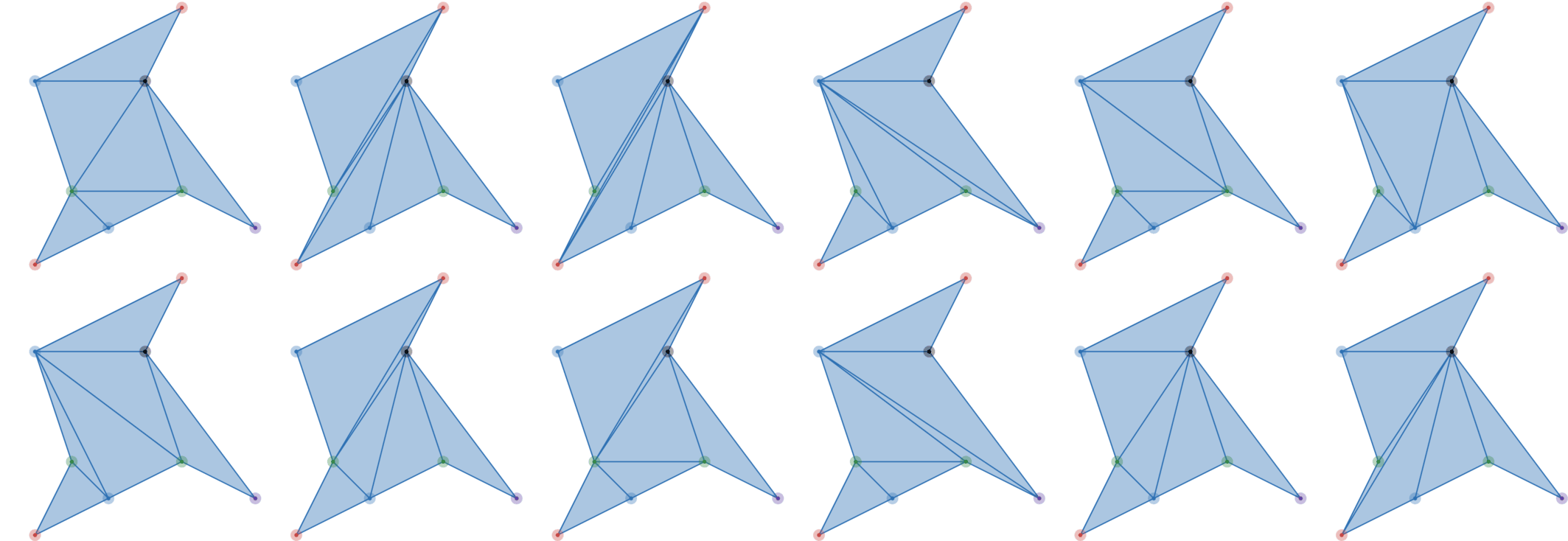 在第一个样例中,所需多边形必须有 $\tfrac{4!}{1! 1! 2!} = 12$ 种三角剖分。下图展示了该多边形的所有三角剖分: