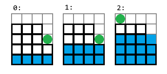 例如,如果 $n=k=4$,$h=[4, 4, 4, 2]$,那么如果你在时刻 $0$ 从第 $4$ 座塔开始传送到第 $1$ 座塔,移动过程如下图所示: