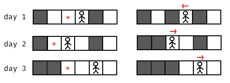 Mani has locked Hamid in a $1 \times n$ grid. Initially, some cells of the grid contain walls and the rest are empty, and Hamid is in an empty cell.