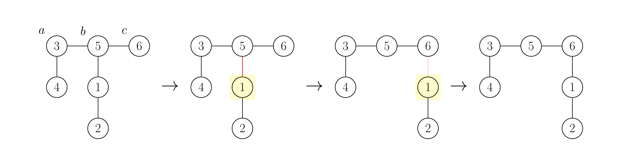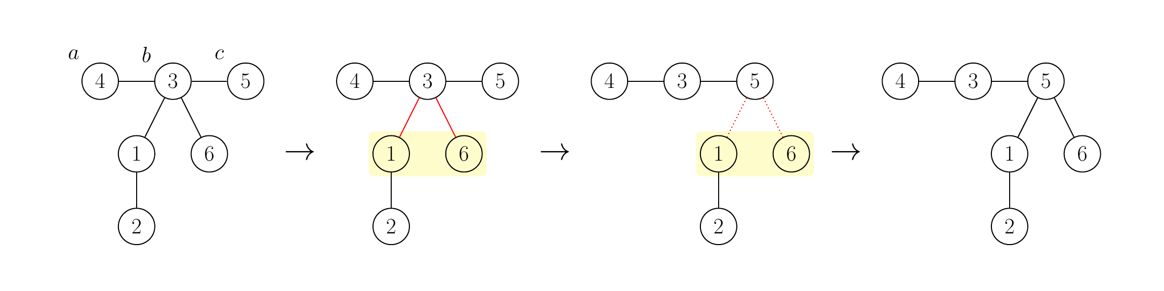 例如,下图展示了在最左侧的树中,$a = 4$,$b = 3$,$c = 5$ 时的这一操作。