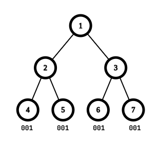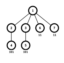 对每个顶点,我们将其“名字”定义为从根节点到该顶点路径上所有顶点标记串联而成的二进制字符串。更正式地说,$\text{name}_1 = \text{label}_1$,对于 $2 \le u \le n$,$\text{name}_u = \text{name}_{p_u} + \text{label}_u$,其中 $p_u$ 是顶点 $u$ 的父节点,$+$ 表示字符串拼接。