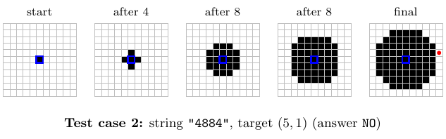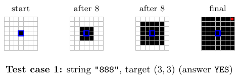 在第一个测试用例中,经过字符串 $\texttt{"888"}$ 的扩展操作后,$(3, 3)$ 格子是黑色的,因此答案是 $\texttt{YES}$。
