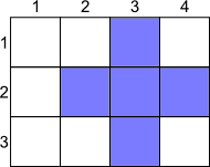 上图显示的是在 $3\times 4$ 的棋盘上,十字 $(0,1,1,0,2,3)$ 的样例。