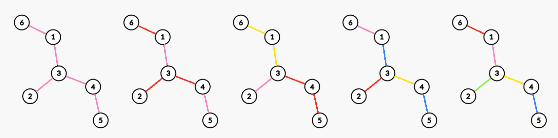 每个测试点包含若干测试用例。第一行包含测试用例个数 $t$($1 \le t \le 10^4$)。接下来是每组测试用例的描述。 每组测试用例的第一行包含一个正整数 $n$($3\le n\le3\cdot10^5$),表示顶点数。 接下来的 $n-1$ 行,每行包含两个正整数 $u_i,v_i$($1\le u_i,v_i\le n$),表示节点 $u_i$ 与 $v_i$ 之间有一条边。 保证输入中的边构成一棵树。 保证所有测试用例中 $n$ 的总和不超过 $3\cdot10^5$。