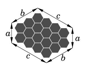 这个大厅的形状也是六边形的。国王沿着大厅的周长走了一圈,发现六条边分别有 $a$、$b$、$c$、$a$、$b$ 和 $c$ 个相邻的瓷砖。