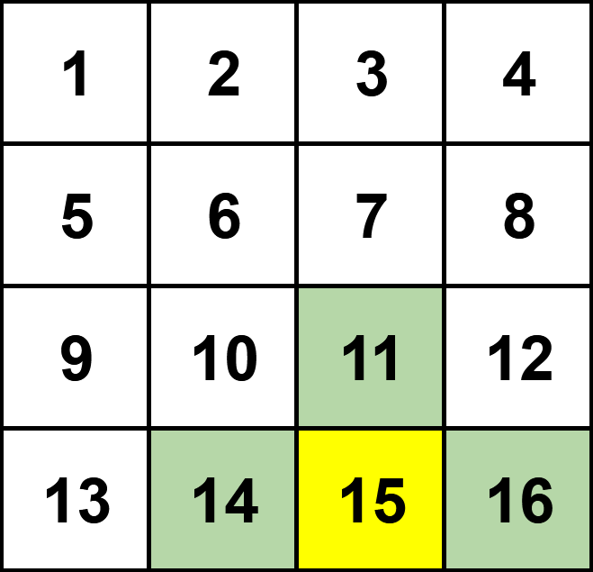 上图为 $n=4$ 的网格以及对应的最优解。其中黄色格子的代价最大,绿色格子为其相邻格子。该格子的代价为 $15 + 11 + 14 + 16 = 56$。