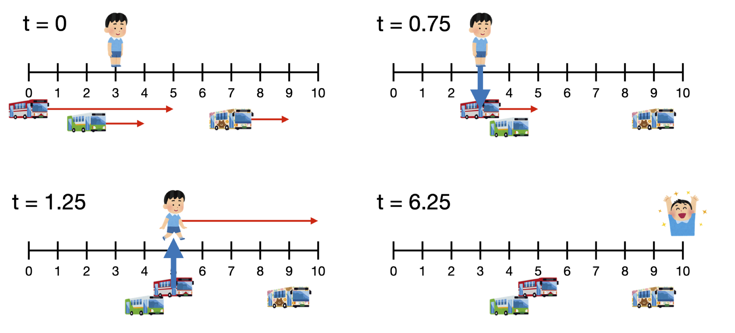 样例 1 说明:某人在 $p = 3$ 时,可以如下方式以 $6.25$ 分钟到达终点: - 等待第一辆公交车到达; - 上车并一直坐到 $t_1 = 5$; - 下车后步行至终点 $\ell = 10$。 如图 1 所示,总耗时 $6.25$ 分钟,这是最短所需时间。 由 ChatGPT 5 翻译