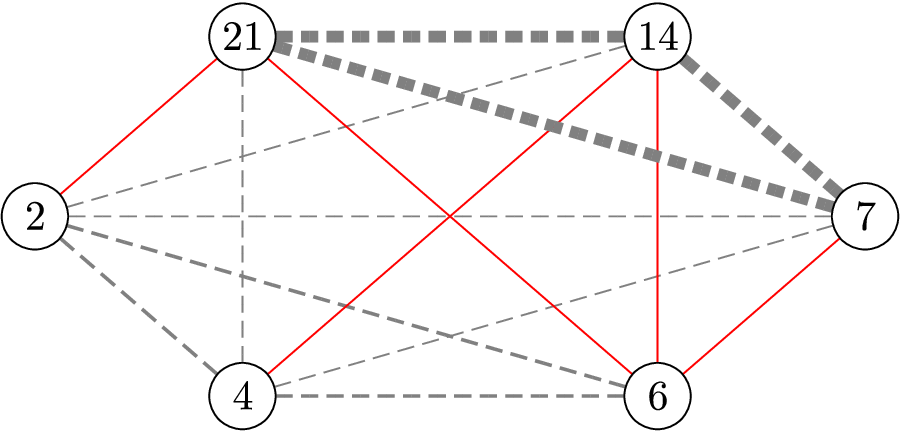 样例 2 说明:图中节点的协议类型分别为 $2$、$4$、$6$、$7$、$14$、$21$。所有可能的连接费用为 $1$、$2$ 或 $7$,由线条粗细区分。存在一种连接方式,通过五条费用为 $1$ 的连接(用红色标出),就能将所有服务器连接起来。
