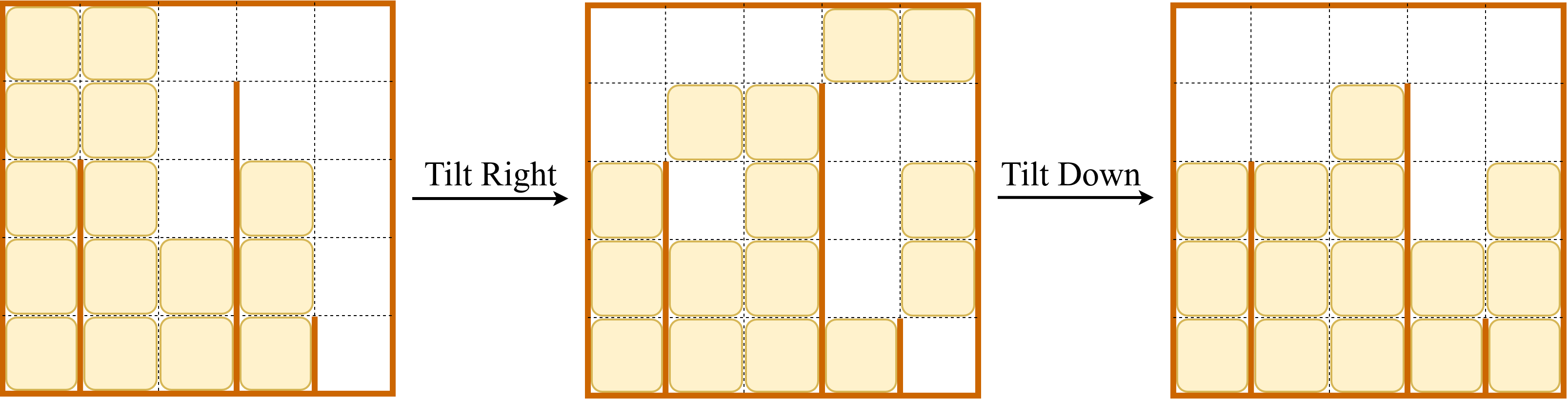 在这两种操作中,所有瓷砖同时移动,只有当被棋盘边界、阻挡条或其他瓷砖阻挡时才会停止。
