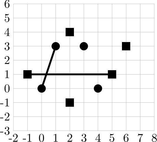 两个灌溉合作社共用一个肥沃的山谷。第一家合作社在田野间维护着若干台泵站;第二家合作社负责监督周围山丘上的水库。每当两个合作社决定分别铺设两根新管道时,这两根管道必须相交——在交点处可以安装一个联合阀门。每根管道总是沿着连接两个不同泵站或两个不同水库的直线段。两根管道若有至少一个公共点,则认为它们相交(无论仅接触还是重合,都算作相交)。 已知每个泵站和每个水库在平面直角坐标系上的精确坐标。对于每个规划方案,判断第一合作社是否能够选出两个不同的泵站、第二合作社是否能够选出两个不同的水库,使得各自连成的两条直线管道相交。如果可能,输出所选泵站和水库的编号;否则,说明该工程无法实现。