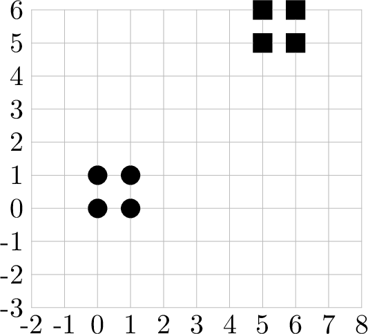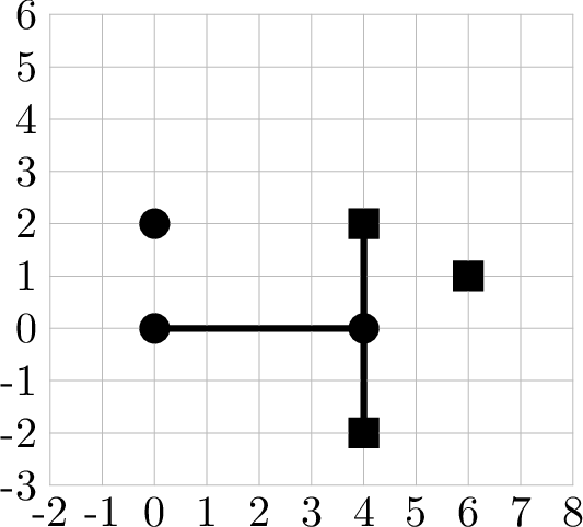 第一行包含一个整数 $t$($1 \le t \le 10^5$),表示规划方案的数量。 对于每个规划方案: 第一行包含一个整数 $n$($2 \le n \le 10^5$),表示第一合作社管理的泵站数量。 接下来的 $n$ 行,每行包含两个整数 $x_i$ 和 $y_i$($|x_i|, |y_i| \le 10^9$),表示第 $i$ 个泵站的坐标。所有泵站的位置各不相同。 接下来一行包含一个整数 $m$($2 \le m \le 10^5$),表示第二合作社管理的水库数量。 接下来的 $m$ 行,每行包含两个整数 $u_j$ 和 $v_j$($|u_j|, |v_j| \le 10^9$),表示第 $j$ 个水库的坐标。所有水库的位置各不相同。 任意一个泵站的位置都不会与任意一个水库的位置重合。 保证所有规划方案中 $n$ 的总和不超过 $2 \times 10^5$,所有 $m$ 的总和也不超过 $2 \times 10^5$。