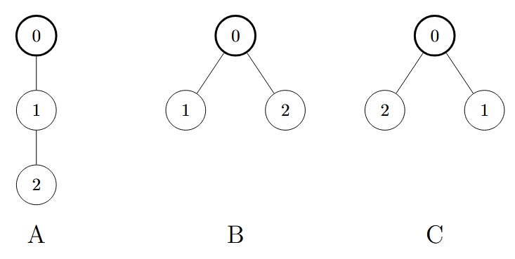 In the first test case, the two different trees are tree A and tree B in the figure below. Note that tree B and tree C are the same.