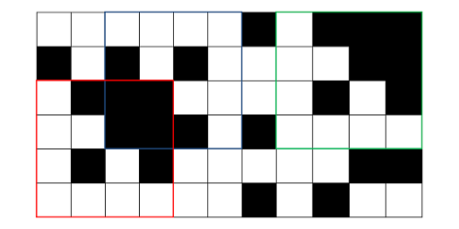The answer for the first sample is shown on the picture below. Fractals are outlined by red, blue and green squares.