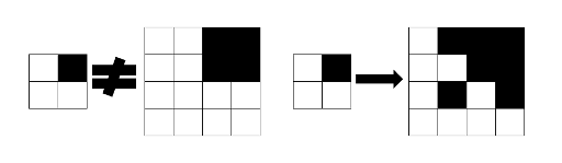 He does it like this. First the boy cuts out a $ 2×2 $ -cell square out of squared paper. Then he paints some cells black. The boy calls the cut out square a fractal pattern. Then he takes a clean square sheet of paper and paints a fractal by the following algorithm: