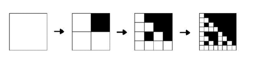 In each of the following steps step 2 repeats. To draw a fractal, the boy can make an arbitrary positive number of steps of the algorithm. But he need to make at least two steps. In other words step 2 of the algorithm must be done at least once. The resulting picture (the square with painted cells) will be a fractal. The figure below shows drawing a fractal (here boy made three steps of the algorithm).