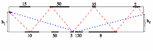 “镜箱”是伊朗国家游乐园(INAP)里一种很受欢迎的游戏。在这个游戏中,有一个长 $10^5$ 厘米、高 $100$ 厘米的木箱。箱子的顶部和底部的某些部分被镜子覆盖。箱子的对面分别有两个很小的孔,分别位于离地面 $h_l$ 和 $h_r$ 厘米的高度处。下图展示了箱子的样子。