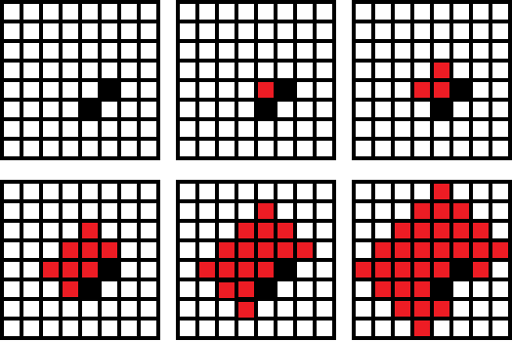 爆炸波分布的示例:图 1 展示了爆炸前的情形,后续的几幅图分别展示了在 $0,1,2,3,4$ 时刻被“清理”的格子。因此,图中的爆炸波传播时间为 $d=4$ 秒。瓦西里·彼得罗维奇想知道,他能否选择两个合适的位置引爆手榴弹,使得所有有睡着老鼠的格子都被清理。请编写程序判断能否做到,并给出解法。