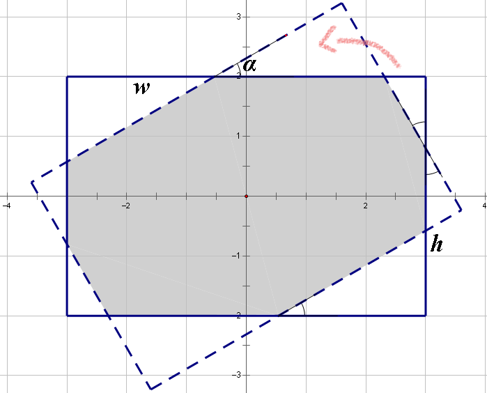 在平面上给定两个矩形。两个矩形的中心都位于坐标原点(即矩形的对称中心)。第一个矩形的边平行于坐标轴:与 $Ox$ 轴平行的边长为 $w$,与 $Oy$ 轴平行的边长为 $h$。第二个矩形可以通过将第一个矩形绕坐标原点顺时针旋转 $α$ 度得到。
