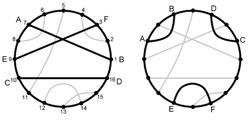 下图显示了两种不同的洞穴分布方案,圆上的点表示端点。左边的方案不合法,虽然每对恋人(A 与 B,C 与 D,E 与 F)都在同一条线的端点上,但距离要求不满足。A 与 B 之间的距离是 2(顺时针从 A 经过 F 到 B),E 与 F 之间的距离也是 2,但 C 与 D 之间的距离是 1(逆时针从 C 到 D 不经过其他洞穴)。右边的方案是合法的,三对的距离都是 1。