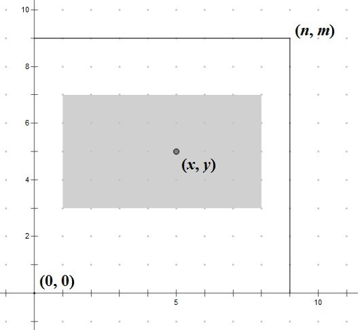 如果存在多个解,选择离 $(x, y)$ 最近的子矩形。这里的“最近”定义为 $(x, y)$ 到该子矩形中心的欧几里得距离尽可能小。如果仍然有多个解,输出字典序最小的一个。这里的字典序最小是指将子矩形视为整数序列 $(x_1, y_1, x_2, y_2)$,选取字典序最小的那个。