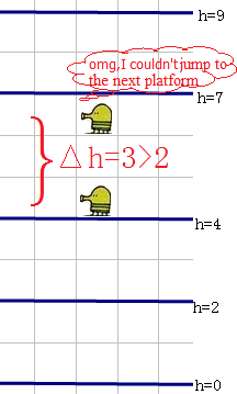 这是一款非常受欢迎的游戏,xiaodao 很喜欢。有一天,xiaodao 在玩游戏时疑惑:会不会存在因为 The Doodler 的跳跃能力有限而无法到达的平台?请考虑如下问题。