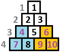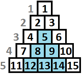 这个金字塔有 $n$ 行,第 $i$ 行包含 $i$ 个格子。每一行相对于上一行向左移动了半个格子的宽度。格子的编号为 $1$ 到 $\frac{n(n+1)}{2}$,如下图所示。