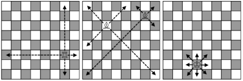 佩蒂亚正在学习国际象棋。他已经学会如何移动王、车和象。让我们提示你如何移动国象棋子。棋盘有$64$个棋格,呈$8\times8$正方形。一个格子可以用$(r,c)$来表示——$r$指行,$c$指列(虽然在经典棋局中用字母和数字一起表示)。每一个棋子占用一个棋格。一次合法的棋步就是执行如下之一:
