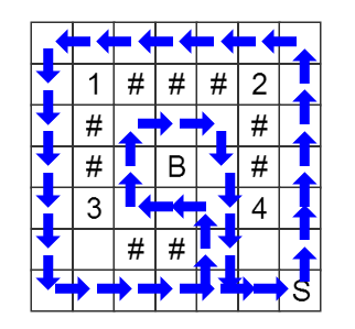 给你一个 $N \times M$ 的地图($N,M \le 20$),地图上 `#` 表示障碍物,`B` 表示炸弹,数字表示宝藏序号(宝藏+炸弹个数 $\le 8$),每个宝藏有价值($-200 \le v \le 200$),`S` 表示出发点。每次移动可以从一个格子移动到相邻格子(上下左右)。寻找一条路径从 `S` 出发再回到 `S` 的封闭路径,移动步数记为 $K$,这个路径所包围的宝藏价值总和记为 $V$,则这条路径的价值为 $V - K$。题目即是求可行的最大的路径价值,并且不能包围炸弹。