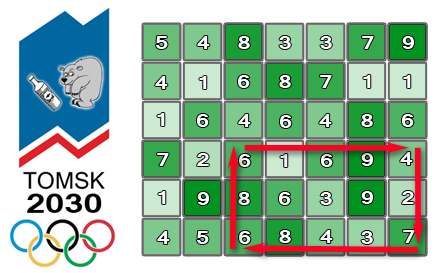 To construct a biathlon track a plot of land was allocated, which is a rectangle divided into $ n×m $ identical squares. Each of the squares has two coordinates: the number of the row (from 1 to $ n $ ), where it is located, the number of the column (from 1 to $ m $ ), where it is located. Also each of the squares is characterized by its height. During the sports the biathletes will have to move from one square to another. If a biathlete moves from a higher square to a lower one, he makes a descent. If a biathlete moves from a lower square to a higher one, he makes an ascent. If a biathlete moves between two squares with the same height, then he moves on flat ground.