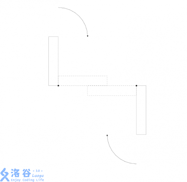 There are two polygons on the plane, A and B. Polygon A rotates around point P, and polygon B rotates