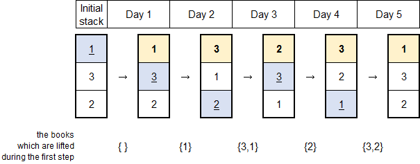 Here's a picture depicting the example. Each vertical column presents the stacked books.