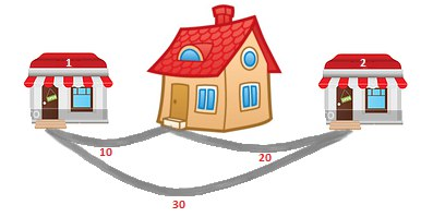Patrick 总是从家出发。他必须拜访两家商店,只能沿现有的三条道路往返,并且最后要返回家中。他不在意多次经过同一家商店或同一条路。他的唯一目标是让行走的总距离最短。