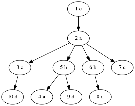 在第二个样例中,各结点的 $F(v)+c_v$ 值为 $ (5,4,2,1,1,1) $。在 $T_2$ 的不同字符串为 ;注意  可以分别通过到结点 $3$ 或 $4$ 的两条路径得到。