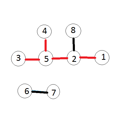 下图对应样例一。组成刺猬的线段被涂成红色。尾巴由编号为 $1$,$2$ 和 $5$ 的点组成。与 $5$ 相连的 $(2,5)$、$(3,5)$ 和 $(4,5)$ 三条线段为刺。因此,该刺猬的美丽值为 $3 \times 3 = 9$。