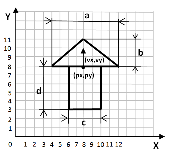 所绘制的箭头需满足以下属性。箭头由一个三角形和一个矩形组成。三角形为等腰三角形,底边长度为 $a$,高为 $b$ 并垂直于底边。矩形的边长分别为 $c$ 和 $d$。点 $(px, py)$ 位于三角形底边的中点处,也位于长度为 $c$ 的矩形边的中点处。三角形和矩形的交集面积为零。从点 $(px, py)$ 指向与底边相对的三角形顶点的方向与向量 $(vx, vy)$ 的方向一致。