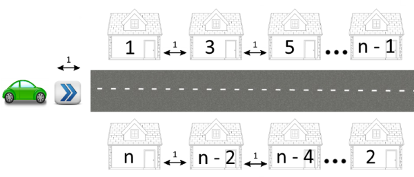 Berland 的主街是一条直线,沿路建有 $n$ 栋房屋($n$ 是偶数)。房屋分布在街道的两侧。奇数编号的房子在街道的一侧,从街道的起点到终点依次编号为 $1$ 到 $n-1$(如图,从左到右)。偶数编号的房子位于另一侧,从街道的终点到起点依次编号为 $2$ 到 $n$(如图,从右到左)。编号为偶数和奇数的对应房屋彼此正对,即 $1$ 号房对着 $n$ 号房,$3$ 号房对着 $n-2$ 号房,$5$ 号房对着 $n-4$ 号房,以此类推。