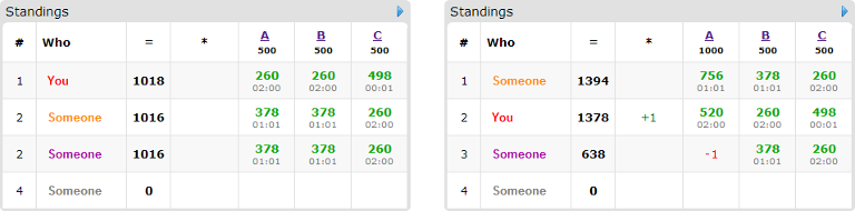 考虑一个典型的 Codeforces 比赛,共有三个题目,并采用动态计分规则。 你已获得一张几乎最终的积分榜。对于每一位参赛者(包括你自己),每道题的通过提交时间都已给出,并且对于每份解答,你是否能够攻击该解答也已知晓。唯一可能在比赛结束前更改积分榜的行为就是你发起的攻击。 你最终可能获得的最好名次是多少? 更严格地说,$n$ 名参赛者参与了本次比赛(包括你)。对于任意一道题,若该题最终有恰好 $k$ 人通过,则该题的最高得分定义如下: 1. 如果 $n < 2k \le 2n$,最高得分为 $500$; 2. 如果 $n < 4k \le 2n$,最高得分为 $1000$; 3. 如果 $n < 8k \le 2n$,最高得分为 $1500$; 4. 如果 $n < 16k \le 2n$,最高得分为 $2000$; 5. 如果 $n < 32k \le 2n$,最高得分为 $2500$; 6. 如果 $32k \le n$,最高得分为 $3000$。 设某题的最高得分为 $s$。如果某选手未通过该题(或其解答被攻击),则该题得 $0$ 分;若其在比赛开始后 $t$ 分钟通过该题(且解答未被攻击),则其得到 $$ \text{score} = \text{int}(s \cdot (1 - 0.004t)) $$ 分(取整下取值)。 参赛者的总得分等于他在三道题获得的分数之和,加上每成功攻击一次获得的 $100$ 分(攻击只由你完成)。 最终你的名次等于严格分数高于你的人数加一。