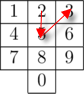 Together with his old phone, he lost all his contacts and now he can only remember the way his fingers moved when he put some number in. One can formally consider finger movements as a sequence of vectors connecting centers of keys pressed consecutively to put in a number. For example, the finger movements for number "586" are the same as finger movements for number "253":
