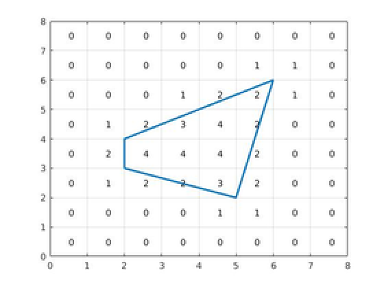 现在 Heidi 已经确保她的僵尸污染等级检测器可以正常工作,是时候发动攻击了!这一次,僵尸巢穴是一个严格凸多边形,且所有顶点都位于整数格点上。对于每一个格点单元,Heidi 都知道其僵尸污染等级——即该单元四个角中有多少个角在巢穴内部或边界上。