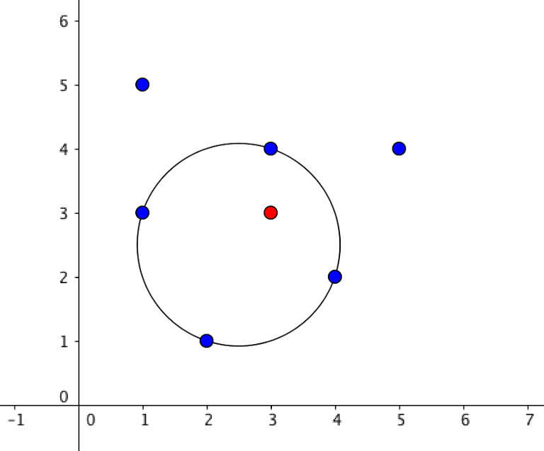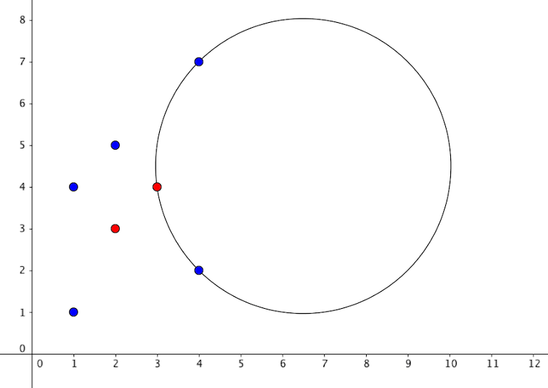 Hongcow 想要在这个平原上画一个圆,使得这个圆内至少包含一个红点,并且圆内不能有蓝点。恰好在圆边界上的点可以被视为在圆内或圆外。