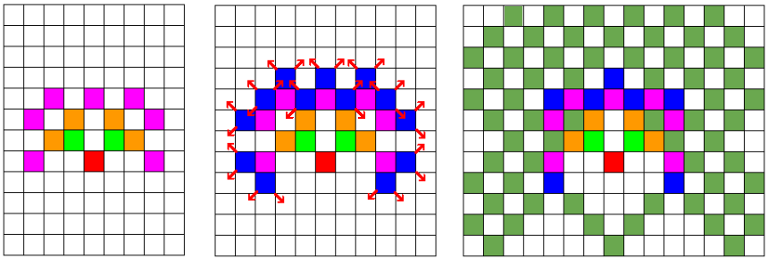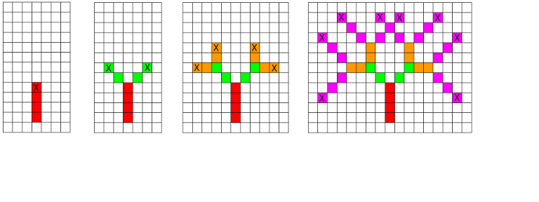对于第一个样例,下图展示了每一层递归结束后的情形。Limak 从最底部的红色格子发射烟花。它经过 $t_1=4$ 个格子(用红色标记),爆炸并分裂成两部分(后续轨迹用绿色标记)。所有爆炸点用 'X' 标记。最后一张图中有 $4$ 个红色,$4$ 个绿色,$8$ 个橙色以及 $23$ 个粉红色格子。所以,总共被经过的格子数量为 $4+4+8+23=39$。 ![](https://cdn.luogu.com.cn/upload/vjudge_pic/CF750D/958e71e20888e0f3c92e01fa2be2e012117f122b.png) 对于第二个样例,下图展示了经过第 $4$、$5$、$6$ 层递归后的情形。中间的图显示了全部将在下一层移动的部分的方向。 ![](https://cdn.luogu.com.cn/upload/vjudge_pic/CF750D/c21fe29a69f3371f920085202e17e34b6a0270b1.png) 由 ChatGPT 5 翻译