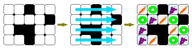 - First, each field is either cultivated or waste. Crop plants will be planted in the cultivated cells in the order of $ (1,1)→...→(1,m)→(2,1)→...→(2,m)→...→(n,1)→...→(n,m) $ . Waste cells will be ignored.
