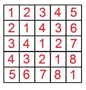 形式化地讲,停车场可以表示为一个 $10^{9}×10^{9}$ 的矩阵。矩阵的每个格子中正好停着一辆车,每辆车都有一个属于自己的机器编号,这个编号是正整数。我们用 $1$ 到 $10^{9}$ 的整数从左到右为矩阵的列编号,从上到下为行编号。巧合的是,对于每一个格子 $(x, y)$,该格子中车辆的编号等于在所有 $1\leq i < x$ 与 $1 \leq j < y$ 的格子 $(i, y)$ 和 $(x, j)$ 里没有出现过的最小正整数。