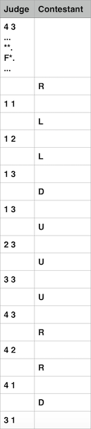 你最多可以按按钮 $2 \times n \times m$ 次。 每按一次按钮,你需要在新的一行输出「U」、「D」、「L」或「R」。然后需要刷新输出缓冲区。刷新后,你会从输入读取玩家位置更新信息,包括两个整数 $x$ 和 $y$,表示玩家的新位置。如果移动的方向没有相邻格子,位置不变。如果玩家进入了危险格子,$x$ 和 $y$ 将会变为 $-1$。 一旦玩家进入了终点格子或者危险格子,你的程序就应终止。 为刷新输出缓冲区,在打印了方向和换行后,你需执行以下操作: - C++:`fflush(stdout)` - Java:`System.out.flush()` - Python:`stdout.flush()` - Pascal:`flush(output)` - 其他语言请参考相关文档。 ### 黑客攻击 想要进行黑客攻击,应使用以下格式: ``` n m swapLR swapUD a_1 a_2 ... a_n ``` 这里,$n$ 和 $m$ 是矩阵的行列数。`swapLR` 表示「L」和「R」方向是否已交换,1 为已交换,0 为未交换。`swapUD` 表示「U」和「D」是否已交换,1 为已交换,0 为未交换。`a_1, a_2, ..., a_n` 是矩阵具体行的描述。