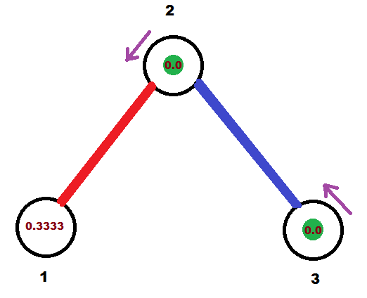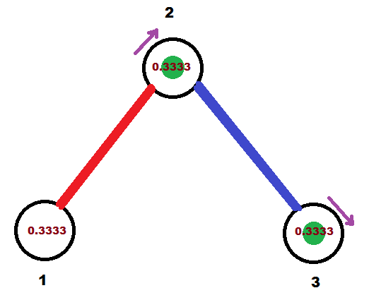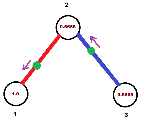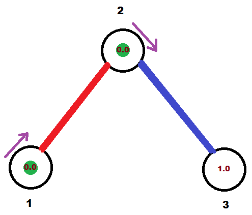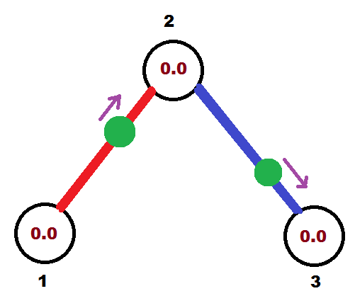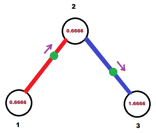 让我们通过一个例子说明点的移动过程。假设路径包含两条边 $(v_{1},v_{2})$ 和 $(v_{2},v_{3})$,点一开始在边 $(v_{1},v_{2})$ 上,并开始朝结点 $v_{1}$ 移动。那么点会到达 $v_{1}$,此时到达了路径的端点,于是“转身”向另一个方向移动,到达 $v_{2}$,然后移动到 $v_{3}$,再次“转身”,再回到 $v_{2}$,如此反复。点以 $1$ 条边每秒的速度移动。例如,$0.5$ 秒内,点会移动相当于半条边的长度。