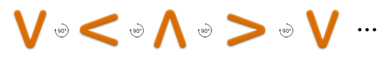 There are two characters in the first string – the starting and the ending position of a spinner. The position is encoded with one of the following characters: v (ASCII code $ 118 $ , lowercase v), < (ASCII code $ 60 $ ), ^ (ASCII code $ 94 $ ) or > (ASCII code $ 62 $ ) (see the picture above for reference). Characters are separated by a single space.