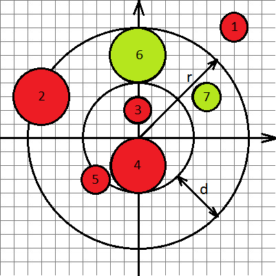 披萨一个半径为 $r$ 的圆,圆心位于原点,披萨中间部分是半径为 $r-d$ 的圆,圆心也在原点。外皮部分就是外面一圈宽为 $d$ 的环。
