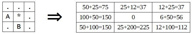 When propagating from the source of the noise, the noise level is halved when moving from one quarter to a quarter that shares a side with it (when an odd number is to be halved, it's rounded down). The noise spreads along the chain. For example, if some quarter is located at a distance $ 2 $ from the noise source, then the value of noise which will reach the quarter is divided by $ 4 $ . So the noise level that comes from the source to the quarter is determined solely by the length of the shortest path between them. Heavily built-up quarters are obstacles, the noise does not penetrate into them.