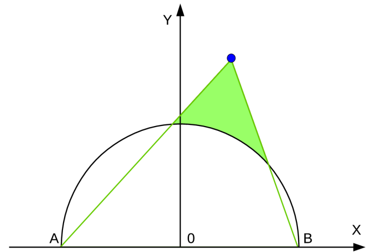 The satellite can be in any point of the universe, except the planet points. Satellites are never located beyond the edge of the universe, nor on the edge itself — that is, they have coordinate $ y>0 $ . Satellite antennas are directed in such way that they cover the angle with the vertex in the satellite, and edges directed to points $ A $ and $ B $ . Let us call this area the satellite coverage area.